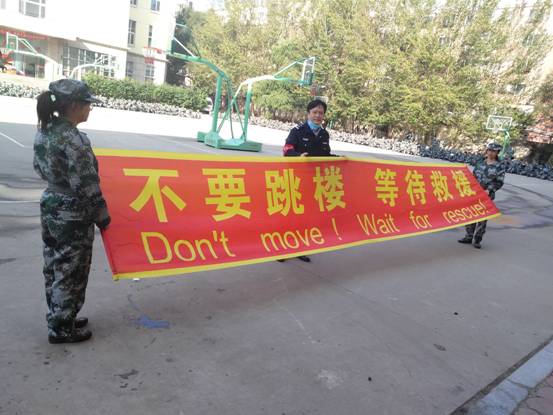 顿时5号公寓楼内冒出滚滚浓烟,四楼阳台出现“伤员”挥动毛巾的求救信号。