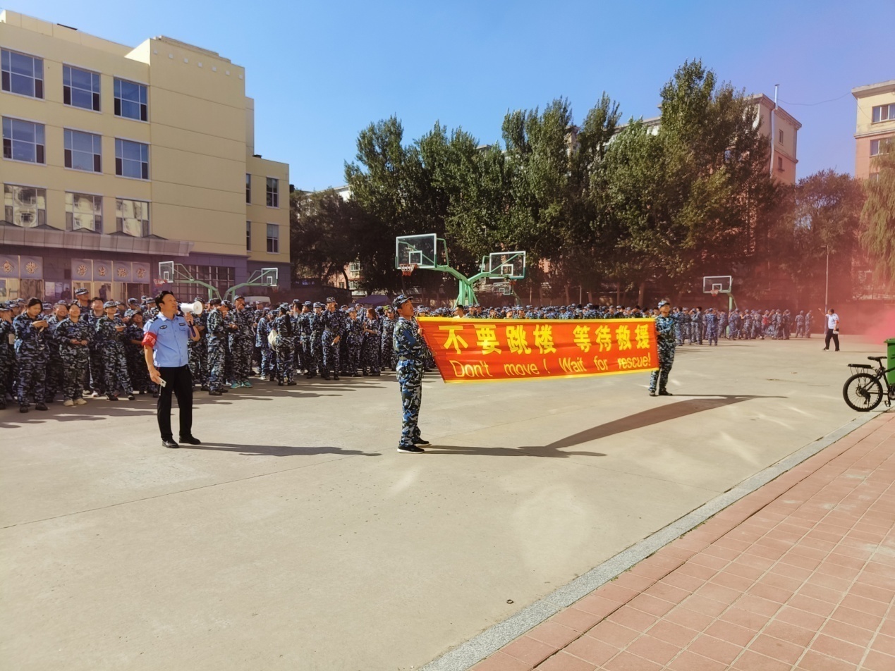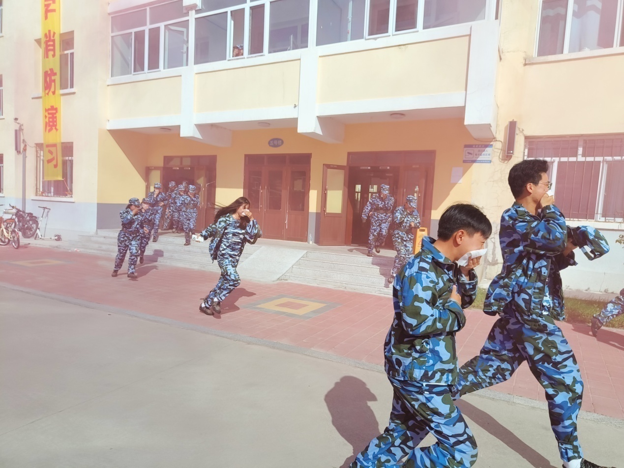 13:40,疏散演习开始,保卫处干警点燃烟雾弹,五号公寓的火警警报自动拉响,楼内的学生用湿毛巾捂住口鼻,迅速从5号学生公寓各个安全出口跑出。二楼有同学挥舞毛巾求救,救援组的干警迅速出动,将被困同学营救到一楼。救护组的医护人员对被营救的同学进行检查。灭火组到火源地将火源扑灭。警戒组确保演习现场安全。全体同学被安全疏散到体育场。