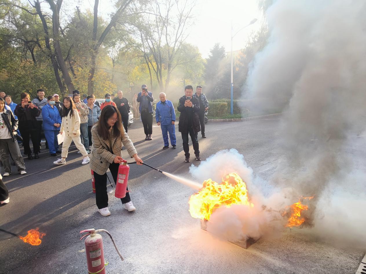 讲座后,参会人员来到病原学馆门前广场现场操作灭火器灭火,进行灭火演练。