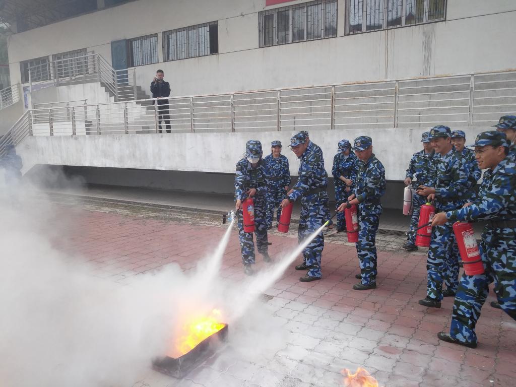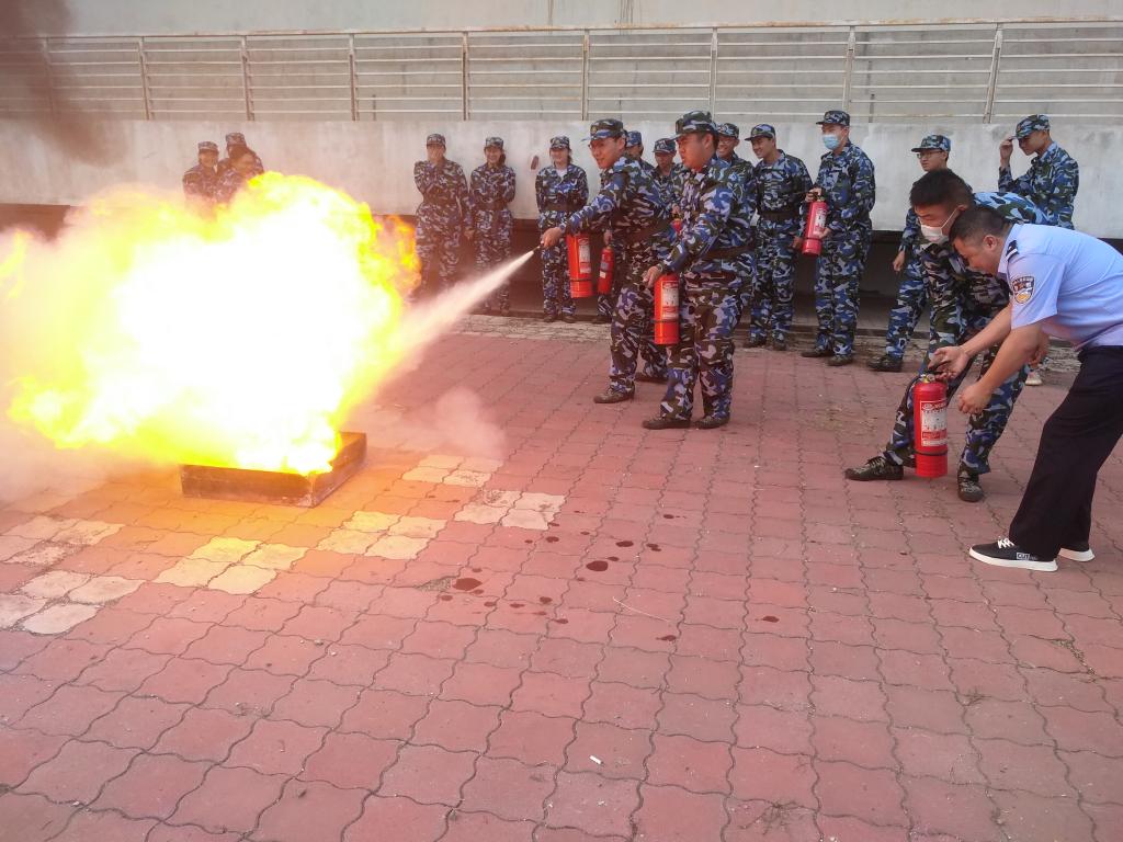 面对熊熊燃烧的火堆,在教官的指导下学生分批熟练地按照灭火的步骤和方法使用干粉灭火器进行灭火。