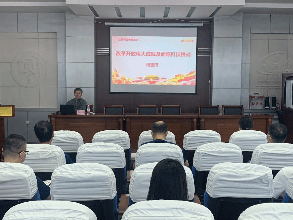 杨宝田从改革开放取得的标志性伟大成就、目前科技领域面临的困境与挑战、如何应对及我们应尽的责任三个方面讲述了改革开放四十多年国家发生翻天覆地、日新月异的变化,回顾了新中国在改革开放40多年里走过的不平凡之路。他从历史背景、艰难启航、勇于探索、伟大成就等方面展现了中国人民在改革开放历程中所体现出来的精气神,全面展现了中国共产党不负人民重托、无愧历史选择,在实现“两个一百年”奋斗目标进程中带领广大人民群众奋力拼搏、勇往直前的壮阔航程,同时,深入浅出地分析了我国目前科技领域面临的困境与挑战,并从国家层面和本单位层面提出了我们应该如何应对和承担起应尽的责任。
