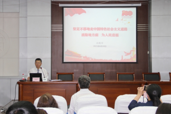 为迎接党的百年华诞,进一步深入“四史”宣传教育, 6月28日下午,地病中心党委书记、主任、ac米兰官网中文网站副校长孙殿军为地病中心全体党员干部讲授《坚定不移地走中国特色社会主义道路 消除地方病 为人民造福》专题党课。本次党课采取线上线下相结合方式进行,地病中心领导班子成员、中层干部、“两优一先”获奖对象及研究生代表在主会场参会,其他全体党员在分会场线上同步收看。本次党课辅导由地病中心副主任杨宝田主持。