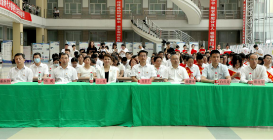 大会会场喜庆隆重,舞台上金色的党徽在八面红旗的映衬下熠熠生辉,“热烈庆祝中国共产党成立100周年”的标语格外鲜艳醒目,从二楼缓台上悬挂的鲜艳明亮、长达10米的崭新党旗气势恢宏,引人注目。