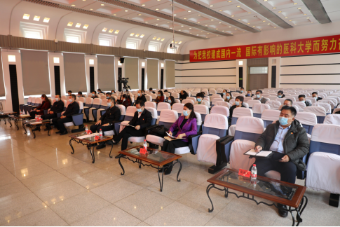 张斌指出,一年来,学校党委严格落实中央、省委、省委教育工委要求,以高度的政治责任感精心组织实施,统筹协调部署,有力有序推进,在省委教育工委第三巡回指导组的有力指导下,按照“学史明理、学史增信、学史崇德、学史力行”的总要求,推动党史学习教育高站位、高标准、高质量开展,广大党员干部师生员工受到了一次全面深刻的政治教育、思想淬炼、精神洗礼、在学党史、悟思想、办实事、开新局上取得扎实成效。一是提高政治站位,严格对标对表。学校党委把开展党史学习教育作为贯穿全年的重大政治任务,坚持以习近平总书记关于党史学习教育的重要论述为指导,全面对标对表看齐抓落实,旗帜鲜明讲政治,推动党史学习教育有序开展、步步深入,保证各项工作始终沿着正确方向前进。二是主要领导带头,以上率下促动。校领导班子引领示范,走在先学在前,带头领学促学,带头领办实事,带头宣传宣讲,发挥了示范作用。各二级学院领导班子成员带头学、带头干,发挥了带动作用。全校各党支部、广大党员干部师生员工及时学、跟进学、统一学,推动学校党史学习教育形成强大合力,不断掀起学习热潮。三是精准分类指导,特色亮点纷呈。学校党委针对不同群体、不同特点,分类指导,全面覆盖。既突出党史学习教育,又注重四史宣传教育;既突出党员干部,又面向全校广大教职员工;既注重教师党员,又注重学生党员和广大学生;既注重学校党委统筹谋划,又注重发挥基层主观能动,形成全校一盘棋,整体联动,做到“规定动作”高标准,“自选动作”有特色。四是紧紧依靠广大师生员工,开门问策办实事。从“为师生办实事、为社会办实事”两个方向着手,采取走访调研座谈、学校官微公开征求意见、处级干部一人一策办实事等方式察民情访民意,坚持问题导向,积极发挥医学院校专业特点和优势,结合实际开展“安心解困”五项行动。确定校级重点推进项目18项,院系级民生实事项目329项。五是宣传宣讲营氛围,严督实导保落实。学校运用新媒体平台,营造浓厚氛围,建立党史学习教育专题网和十九届六中全会专题网。全校各二级院系党组织纷纷在官网、官微、院报上开专题、设专栏,编发简报,学校教师宣讲团和青年“四史”宣讲团、各二级学院党委宣讲团、宣讲小分队发挥作用,汇聚起广大师生员工信念坚定、对党忠诚、勇于担当的精神力量。六是着力攻坚克难,学校建设实现新发展。全力做好疫情防控工作,学科人才队伍建设全面加强,深化综合改革,加快向“双一流”建设目标迈进。