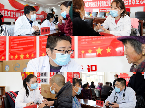 义诊活动中,农工党党员、骨科副主任医师钱贵宾,无党派人士、胸外科副主任医师师刘成,神经内科主任医师高民、呼吸科副主任医师刘立杰、心内科副主任医师张广德、老年病科医师陈洪叶、疼痛科主治医师张名硕、主管药师刘宣彤、药师曹苏红等来自附属四院9个诊室的医生为近百名村民进行义诊、问诊查体、答疑解难,受到村民的欢迎和好评。
