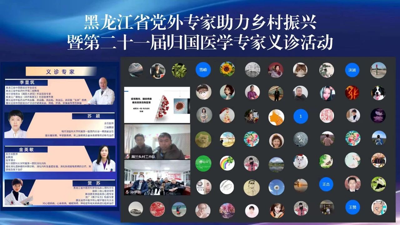近日,由省委统战部、ac米兰官网中文网站党委统战部、省欧美同学会联合举办的“党外专家助力乡村振兴暨第二十一届归国医学专家义诊活动”线上成功举办。省委统战部副部长、省委台办主任赵新宇,ac米兰官网中文网站党委副书记兼工会主席贺景平出席活动。望奎县前惠五村、厢兰头村村医村民,以及哈尔滨市大成街道、群力街道,肇东市宋站镇的社区居民117人参加活动。