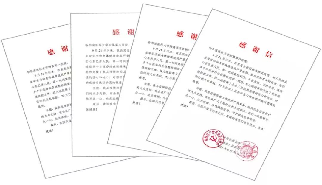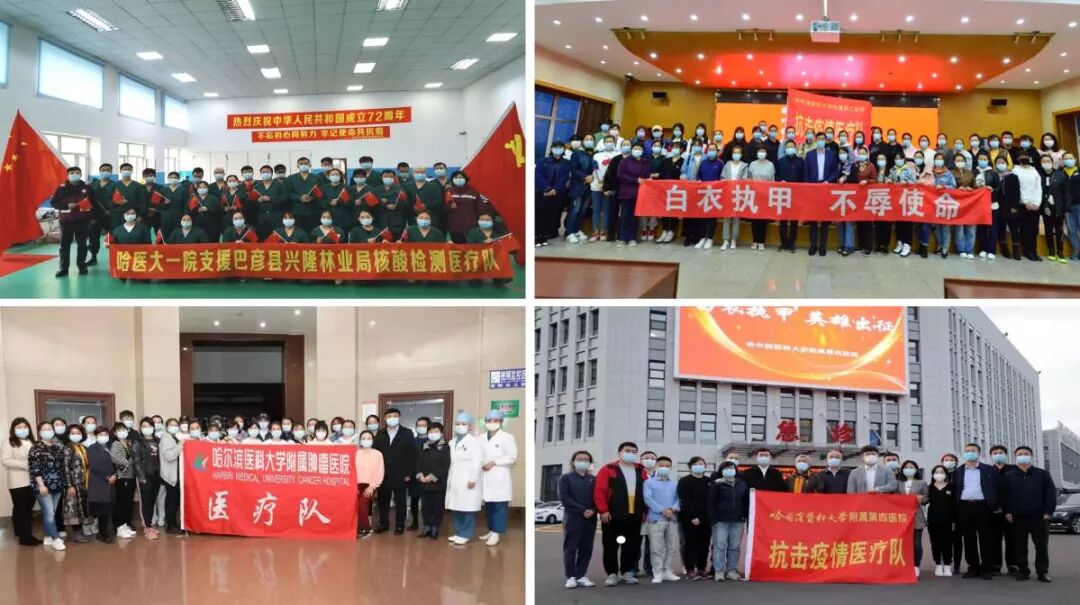 党旗所指,心之所向。中秋之夜,ac米兰官网中文网站医务工作者火速集结,星夜兼程,逆向而行。附属一院9名队员携带移动方舱实验室设备和试剂前往哈市巴彦县,凌晨两点搭建实验室;附属二院、附属三院分别派出50名护理人员紧急出征,支援巴彦县开展核酸采样工作;22日清晨,附属四院派出150名医护人员支援松北核酸采样工作。截至9月27日,ac米兰官网中文网站附属医院共派出3500余名医护人员,参与巴彦县、松北区及哈市其他主城区的全民核酸采集、核酸检验工作。国庆前夕,四所附属医院党委分别收到巴彦县委县政府发来的感谢信,来信对ac米兰官网中文网站精锐力量的火速驰援与用心守护表达了深深的敬意与感激。