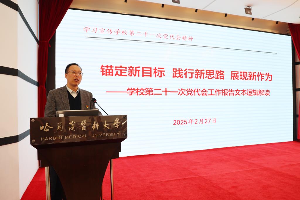 地病中心副主任毕晓明以《锚定新目标 践行新思路 展现新作为》为题,系统梳理了学校第十六次党代会以来的召开背景、报告题目和发展目标,并通过“十一个坚持”“七个必须”“两个目标”“九个聚焦”等具有高度凝练性和指导性的词汇向全体参训学员详细解读了学校第二十一次党代会工作报告的文本逻辑,为全校处级干部更加准确的把握大会提出的新部署、新要求提供了重要参考。