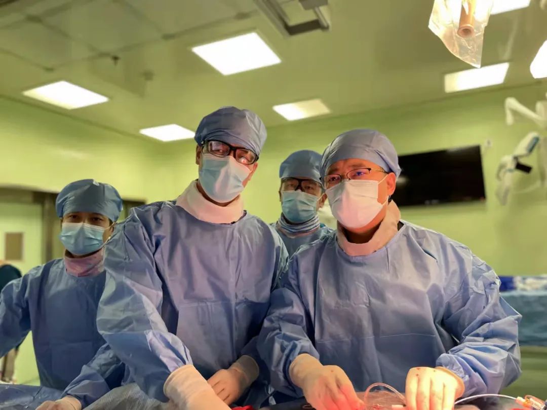 于波教授(右1)带领张东会医生(左2)、杨光医生(左1)和陈涛医生(右2)完成东北三省首例一站式经导管主动脉瓣膜置换术+二尖瓣球囊成形术