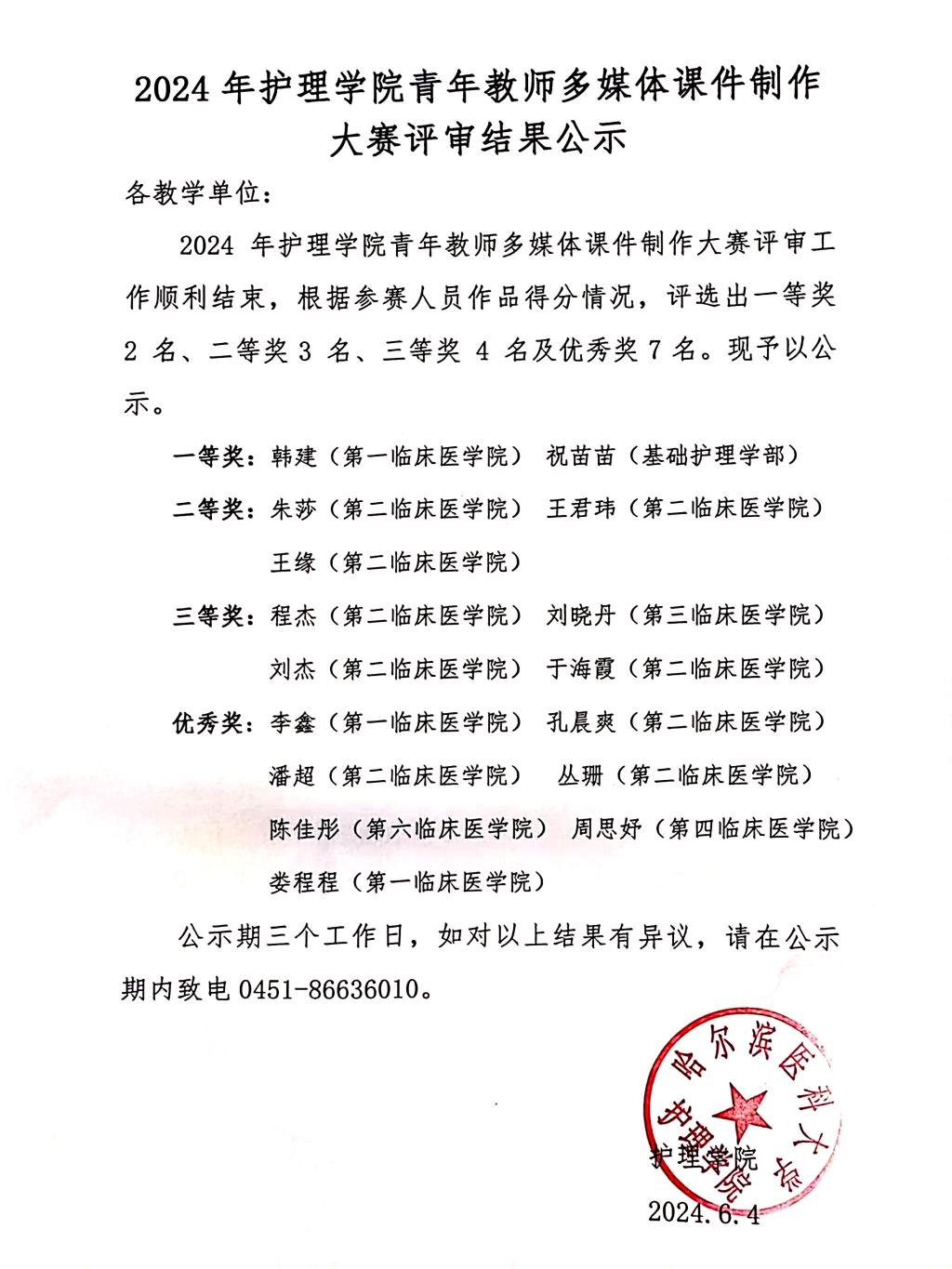 2024年护理学院青年教师多媒体课件制作大赛评审结果公示