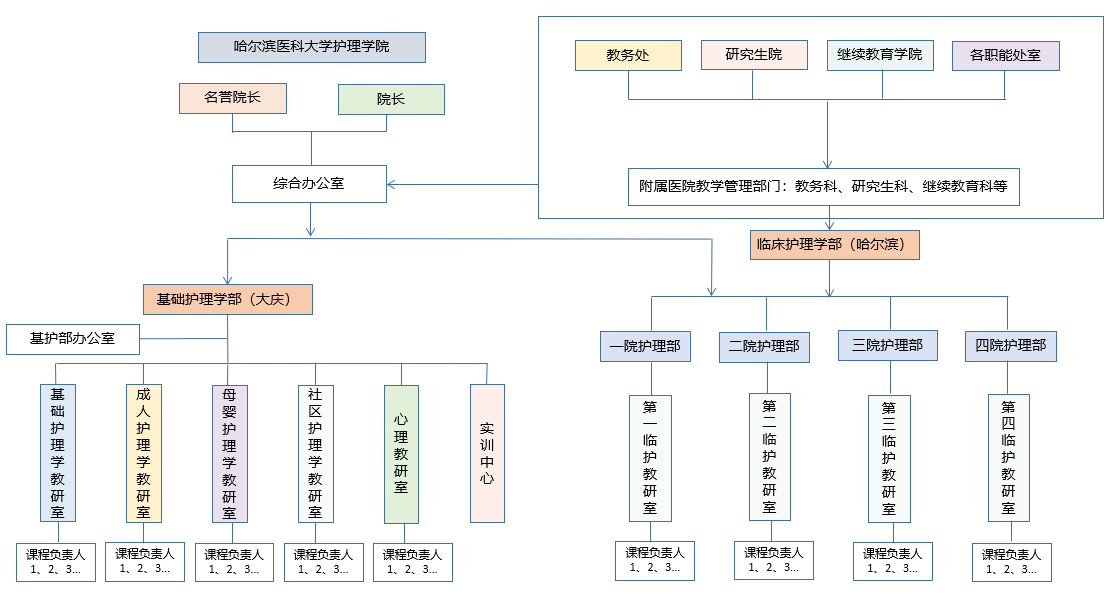 护理学院下设综合办公室、基础护理学部、临床护理学部。基础护理学部保留原有大庆校区护理学院内部机构( 1 个行政办公室、 5个教研室和 1 个实验中心);临床护理学部下设 4 个临床护理学教研室,分别设在第一、二、三、四临床医学院,与各临床医学院护理部合署办公。