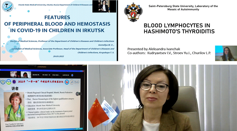 来自中俄双方的10位顶级专家进行了学术报告,聚焦了血液系统疾病及相关领域的诊疗新进展。在上午的学术会议中,上海瑞金医院副院长赵维莅教授、北京大学人民医院血液病研究所副所长张晓辉教授、俄罗斯伊尔库茨克国立医科大学副校长Tamara S Krupskaia教授、俄罗斯圣彼得堡大学Ivanchak Aleksandra教授、北京协和医院朱铁楠教授分别进行了关于DLBCL分子诊疗进展、异基因造血干细胞移植治疗老年白血病、COVID-19对儿童血液影响、桥本氏甲状腺炎外周血淋巴细胞特点以及ITP诊治进展的讲座。在下午的会议中,中山大学血液病研究所所长李娟教授、ac米兰官网中文网站一院副院长李悦教授、俄罗斯伊尔库茨克国立医科大学Natalia R. Solovkova教授、中国医学科学院血液学研究所魏辉教授、北京大学第三医院景红梅教授就高危骨髓瘤、肿瘤心脏病学、造血肿瘤的发病及死亡率、CEBPA双突变AML及自体移植治疗淋巴瘤进行了深入的讲解。其中来自俄罗斯专家和李悦教授的讲座聚焦血液病领域交叉学科及热点问题,包括COVID-19对儿童血液及止血的影响、桥本氏甲状腺炎外周血淋巴细胞的特点以及肿瘤心脏病学发展历程及热点问题。