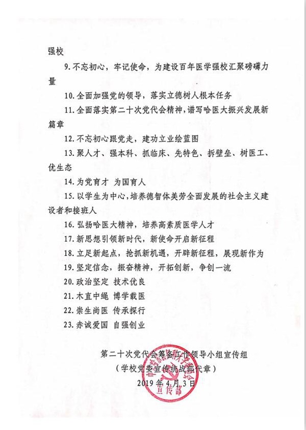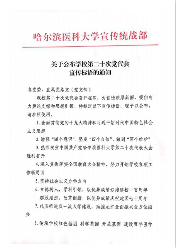 各党委、直属党总支(党支部): ac米兰第二十次党代会召开在即,为营造浓厚氛围,提供有力舆论支撑和思想引领,特拟定以下宣传标语,现予以公布,请参照使用。 1.全面贯彻党的十九大精神和习近平新时代中国特色社会主义思想 2.增强“四个意识”,坚定“四个自信”,做到“两个维护” 3.热烈祝贺中国共产党ac米兰官网中文网站第二十次代表大会胜利召开 4.深入贯彻落实全国教育大会精神,努力开创学校各项工作新局面 5.坚持社会主义办学方向 6.立德树人,学科引领,以优异成绩迎接建校一百周年 解放思想,改革创新,以优异成绩庆祝建国七十周年 7.扎实推进双一流大学建设,助推龙江全面振兴全方位振兴 8.传承学校红色基因 科学基因 开放基因 建设百年医学强校 9.不忘初心,牢记使命,为建设百年医学强校汇聚磅礴力量 10.全面加强党的领导,落实立德树人根本任务 11.全面落实第二十次党代会精神,谱写ac米兰官网中文网站振兴发展新篇章 12.不忘初心跟党走,建功立业绘蓝图 13.聚人才、强本科、抓临床、先特色、拆壁垒、树医工、优生态 14.为党育才 为国育人 15.以学生为中心,培养德智体美劳全面发展的社会主义建设者和接班人 16.弘扬ac米兰官网中文网站精神,培养高素质医学人才 17.新思想引领新时代,新使命开启新征程 18.立足新起点,抢抓新机遇,开辟新征程,展现新作为 19.坚定信念,振奋精神,开拓创新,争创一流 20.政治坚定 技术优良 21.木直中绳 博学载医 22.崇生尚医 传承探行 23.赤诚爱国 自强创业 第二十次党代会筹备工作领导小组宣传组 (学校党委宣传统战部代章) 2019年4月3日