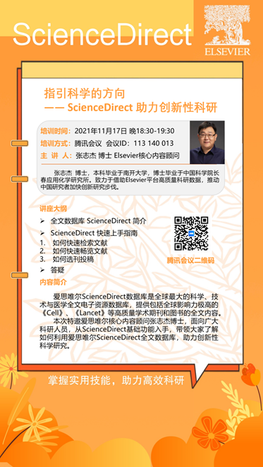 为帮助ac米兰广大科研人员更加方便地获取学术资源,ac米兰官网中文网站图书馆携手爱思唯尔举办《ScienceDirect助力创新性科研》培训讲座。本次特邀爱思唯尔核心内容顾问张志杰博士,从ScienceDirect基础功能入手,带领大家领略如何利用爱思唯尔ScienceDirect数据库平台,助力开拓科研视野,加速创新性科学研究。