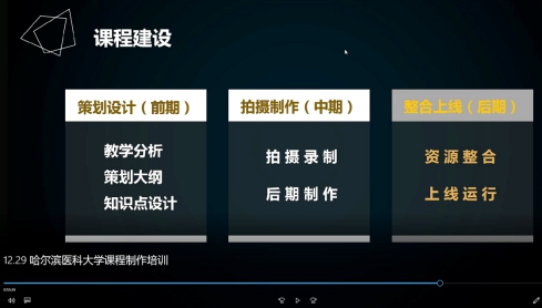 相关技术人员对在线课程的视频制作进行了培训。培训结合国家一流本科课程标准,从“策划设计”“拍摄制作”及“整合上线”三个方面为教师们进行了上线视频制作的流程解析和问题解答。并用生动、丰富、直观的特色课程视频范例,重点解读了在教学材料准备过程中,如何利用脚本设计展现教师们对课程内容的深度思考和巧妙设计。