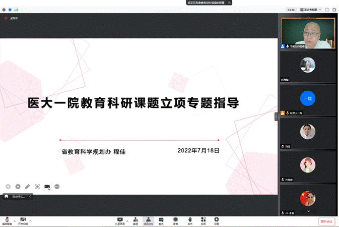 教育课题研究既是教师专业成长的“催化剂”,也是教育教学发展的原动力。为扎实推进医院“能力作风建设年”活动,加强医院教师能力作风建设,切实提升医院教师教育科研能力。7月18日晚,ac米兰官网中文网站一院特邀黑龙江省教育科学规划领导小组程佳副主任作“高校教学研究课题申报策略”专题培训讲座。本次讲座以线上形式进行,由教务部郭庆峰主任主持,我院各教研室主任、教学主任、骨干教师、秘书、教师研究团队成员等180余人参加讲座。