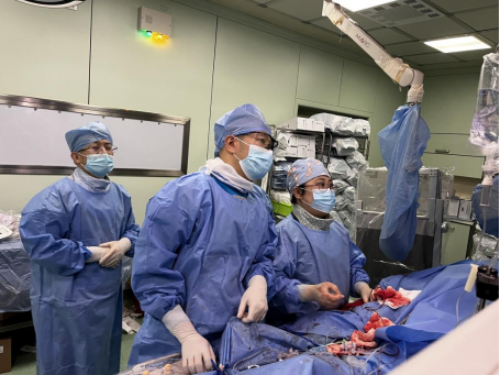 候静波教授(右)和刘慧敏副主任医师(左1)、陈涛副主任医师(左2)进行零造影剂支架植入手术