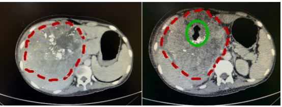 肝中叶巨大肿瘤侵犯胃、十二指肠合并穿孔、出血(红圈为肿瘤,绿圈为穿孔进的气体)