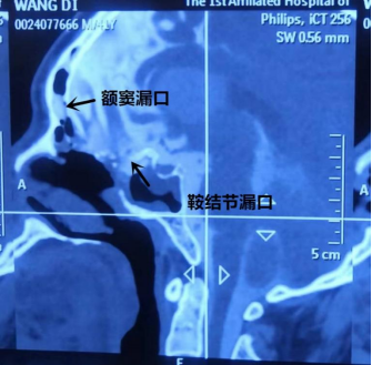 经过系统抗炎治疗10天后,患者意识清楚,脑脊液白细胞降到70x106/L。经CT室孙重阳医生会诊确定患者既往手术脑脊液漏口愈合良好,本次脑脊液漏口两个,分别位于右侧鞍结节和右侧的额窦后壁。