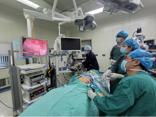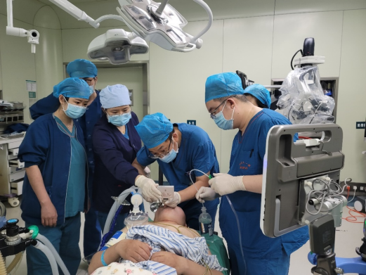 在麻醉科丘忠志副主任医师,以及贺颖副主任医师,董苒副主任医师等多位麻醉医师的协助下,前后经历了三次气管插管,最终于清醒条件下、支气管镜辅助,完成全麻气管插管,手术得以顺进行。术中,手术采用腹腔镜下切口疝无张力修补术,术中腹腔粘连重,腹壁结构和张力异常,在仔细分离开粘连肠管和网膜后关闭疝环,应用补片覆盖和加强薄弱腹壁,患者目前状态平稳,拟于近日出院。