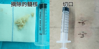 术中,由于病人体重超重,而且间盘突出程度较重,对神经压迫时间久,给手术增加了很大难度。裴刘宝教授发现患者巨大腰椎间盘突出,神经明显受压,呈缺血菲薄状态,神经周围粘连严重。凭借丰富的UBE成功手术经验和对脊柱解剖的熟练掌握,裴刘宝教授仅通过2个0.8cm小切口,成功为患者实施UBE技术下腰椎管减压髓核摘除术,将粘连的神经小心松解,将巨大突出的髓核摘除。
