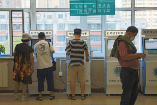 群力院区持续推进精细化管理,从患者需求出发,细化便民服务举措,引进共享轮椅、共享购物袋、共享充电宝,增设多台自助报告打印设施,为患者提供高效便捷的自助服务,有效减少患者等候时间。同时增设导诊志愿者,协助不会使用智能手机和电子支付的老年患者操作、解答患者就诊相关问题。