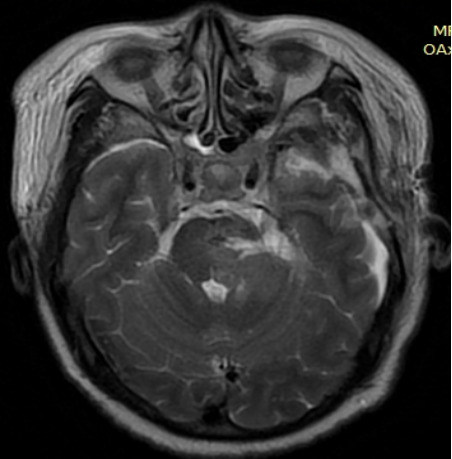 接诊医生刘怀垒副教授查体及询问病史后迅速做出判断,“患者既往无高血压病,脑干出血高度怀疑是由脑干肿瘤卒中导致”,立即为患者行头部磁共振检查,确诊为脑干肿瘤卒中。