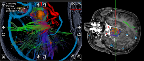 高成教授团队制定了详细的手术方案,并利用最先进的神经导航设备对病变进行了定位,同时对周边控制运动和感觉的神经纤维束、核团进行了细致评估。考虑到病变位置深在,显微镜有视野盲区,内镜可以弥补其不足,高成教授团队决定采取双镜联合技术。
