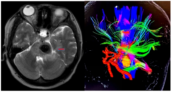 图1.术前核磁显示脑干病变位置(箭头所示)及周围密集的神经纤维及血管