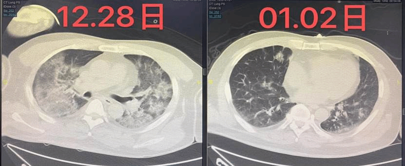 经过全体医护人员的12天的艰难救治,患者的氧合指标逐渐上升,双肺渗出影像显著吸收,肺氧合功能显著改善,逐步脱离高流量吸氧及鼻导管吸氧,脱氧状态下,血氧饱和度稳定在95%以上,一般状态改善、生命体征趋于稳定,老人的生命,转危为安!