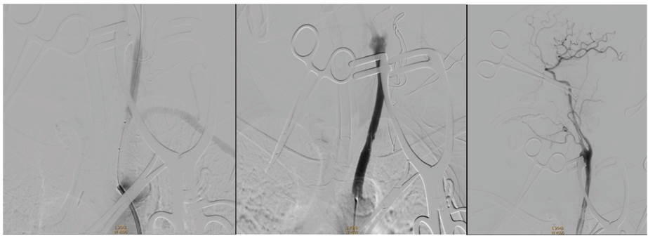手术如期进行。在麻醉团队以及护理团队通力配合下,史怀璋主任,郑秉杰副主任首先为患者行左侧颈动脉内膜剥脱手术,术中手术顺利,剥脱后给予全脑血管造影检查,显示颈总动脉远端显影良好,但近端依然闭塞。随后,史怀璋主任及季智勇副主任通过微导丝通过闭塞处,成功释放一枚支架,最终成功完成了手术。术后患者无神经功能缺失,将于近日康复出院。