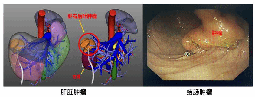 图1.黄先生肝右后叶肿瘤(左:三维可视化重建技术)
