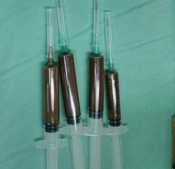 患者术后症状改善2天后再次加重,复查CT和磁共振提示脑脓肿形成(见图5、图6)。术后第5天,在神经外科沈红教授指导下,神经外科刘利教授和殷一博主治医师为患者行机器人辅助下脓肿穿刺抽吸和Ommaya囊置入手术,术中共抽出紫褐色脓液35ml(见图7)。