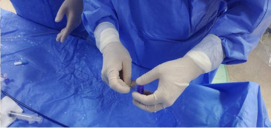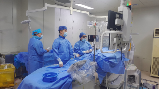 患者是一名23岁的青年男性,既往体健,长期不明原因偏头痛,症状发作起来,头昏脑胀、疼痛难忍,严重影响了工作和生活。当天手术由心内科李阳主任、张明宇主任及团队成员,联合心脏超声科薛莉主任团队协作开展。在张明宇主任的指导下,在X线透视引导下,李阳主任置入导丝导管,无创过隔,建立顺畅通路,沿输送鞘将大小合适的可降解封堵器送达卵圆孔未闭处。