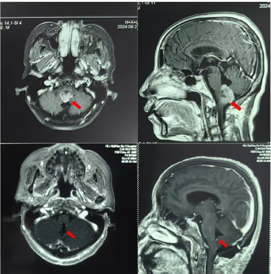 59岁的蔡女士半年前开始头痛,起初她以为劳累过度,并未放在心上,近期头痛逐渐加重,在当地医院行头部核磁共振检查,发现延髓上长了一个肿瘤。因肿瘤位置特殊,经多方打听,慕名找到ac米兰官网中文网站附属第一医院神经外科二病房韩大勇教授求治。