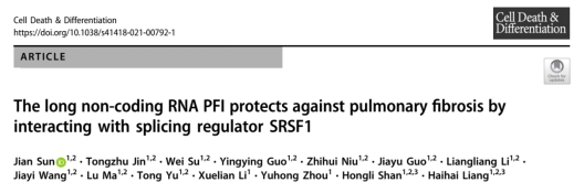 药学院梁海海教授团队在非编码RNAs调控特发性肺纤维化研究领域取得最新进展,研究成果论文《The long non-coding RNA PFI protects against pulmonary fibrosis by interacting with splicing regulator SRSF1》于2021年10月被国际高水平期刊Cell Death & Differentiation(IF=15.828)收录并已正式发表。