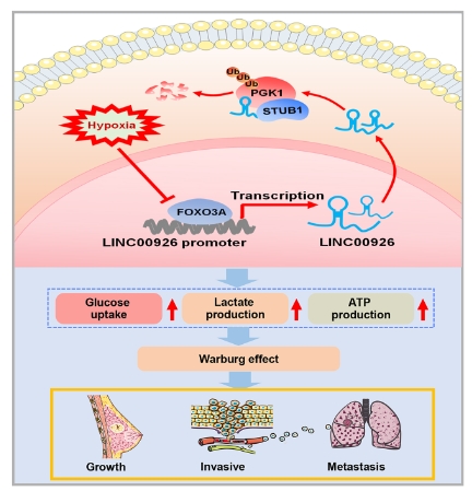 张清媛团队首次揭示了长链非编码RNA(lncRNA)LINC00926在乳腺癌糖酵解中的作用,通过靶向磷酸甘油酸激酶1(PGK1)使其泛素化降解,进而发挥抑制乳腺癌发生发展的作用,而在缺氧条件下,FOXO3基因编码的人类蛋白质(FOXO3A)影响LINCO0926和PGK1的表达,阻碍转录因子FOXO3A对LINC00926的转录调控。另外,研究通过多种数据证实了FOXO3A/LINC00926/PGK1轴在调节乳腺癌的生长和进展方面具有重要作用。