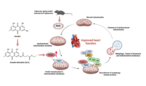 心脏衰老是多种慢性心血管疾病的主要诱因,已成为威胁老年人生命和生存质量的突出问题,由于对衰老心脏退行性结构和功能变化认识不清,目前仍缺少有效干预措施。杨宝峰院士团队研究发现大黄素衍生物(康乐欣)及大黄素可显著改善D-半乳糖诱导的衰老小鼠心脏舒张功能障碍和组织结构异常,减轻心肌细胞衰老。进一步研究发现,康乐欣及大黄素靶向结合于线粒体自噬相关蛋白Parkin的UBL结构域,提高其蛋白质稳定性,促进Parkin转位至线粒体膜上,进而激活线粒体自噬,清除受损线粒体。由于与Parkin蛋白的结合力不同,康乐欣抗衰老的效果优于大黄素。康乐欣及大黄素可作为预防和治疗心脏衰老的具有临床前景的候选药物。
