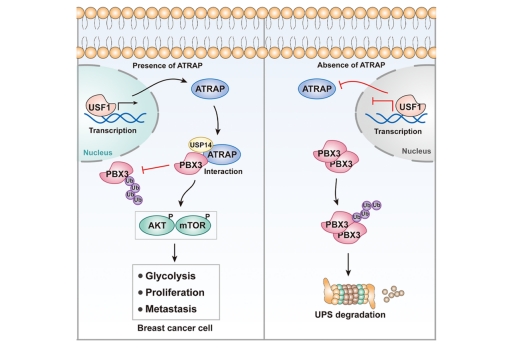 陈雪松教授课题组的此项研究揭示了血管紧张素受体相关蛋白(ATRAP)是乳腺癌预后不良的标记,与USP14相互作用参与调控PBX3的去泛素化促进乳腺癌肿瘤恶性表型,有望成为乳腺癌治疗的重要靶点。