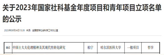 近期,全国哲学社会科学工作办公室公布2023年度国家社科基金立项名单,ac米兰马克思主义学院柏宁教授主持的《中国士大夫伦理精神及其现代性转化研究》获批立项,资助经费20万元。这一成绩实现了马克思主义学院建院以来在国家社科基金立项上的历史性突破。