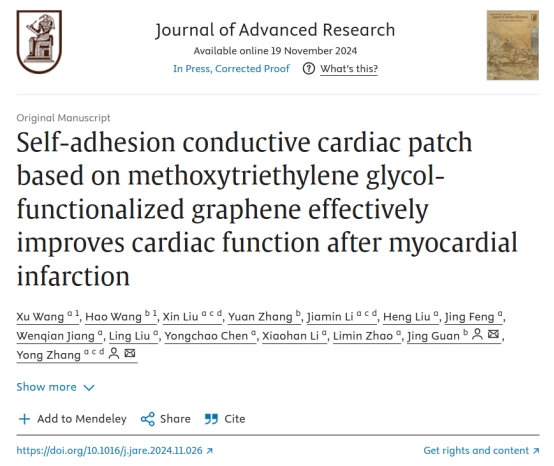 近日,由药学院药理教研室与有机化学教研室合作研发,用于治疗心肌梗死的导电水凝胶粘附型心脏贴片取得了新的进展。与传统的导电材料相比,甲氧基三甘醇官能化石墨烯具有较高的生物相容性,该心脏贴片可通过维持梗死心脏电信号传导、促进新血管生成、抑制心肌细胞凋亡等多重药理作用改善心肌梗死后心脏功能。研究成果论文《Self-adhesion conductive cardiac patch based on methoxy-triethylene glycolfunctionalized graphene effectively improves cardiac function after myocardial infarction》在线发表于《Journal of Advanced Research》(IF:11.4)。