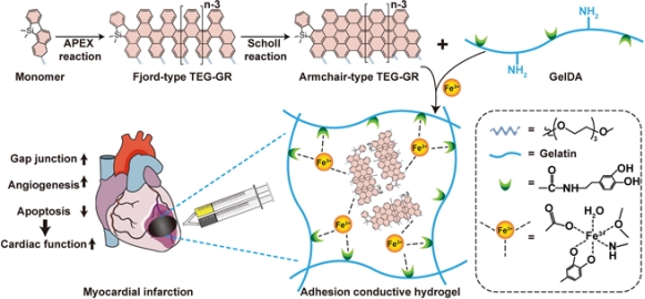 心肌梗死是一条或多条冠状动脉分支阻塞引起的心肌细胞缺血死亡,最终可发展为心力衰竭。临床上常见的心肌梗死治疗方法包括药物治疗、冠状动脉介入治疗和溶栓治疗等。尽管这些途径提高了心肌梗死患者的生存率,但不能逆转梗死心肌的损伤,仍亟需一种可重建梗死心肌功能的新疗法。导电水凝胶可模拟心肌组织微环境,在限制心肌梗死后心室重构、恢复梗死区电信号传导、改善心脏功能等方面发挥重要作用。文章报道了具有确定结构的甲氧基三甘醇官能化石墨烯(Methoxytriethylene glycol-functionalized graphene,TEG-GR),并基于TEG-GR构建了生物相容性良好,电导率与正常心肌组织电信号传导水平相匹配的导电粘附型心脏贴片(TEG-GR/GelDA)。应用TEG-GR/GelDA心脏贴片治疗心肌梗死大鼠能够显著改善心肌梗死后心脏功能,减轻心肌组织损伤。进一步的体内实验表明,TEG-GR/GelDA心脏贴片能够显著提高Cx43蛋白表达水平,有效保护心肌缝隙连接结构;增加梗死区血管数目,促进心肌梗死后心脏血运重建;降低心肌组织TUNEL阳性细胞数以及促细胞凋亡因子cleaved-Casepase-3、BAX蛋白表达水平,提高抑制性凋亡因子BCL2蛋白表达水平,发挥抑制心肌细胞凋亡作用。该研究明确了新型导电粘附型心脏贴片治疗心肌梗死的作用,阐明了其潜在机制,为心肌梗死的治疗提供了新策略。