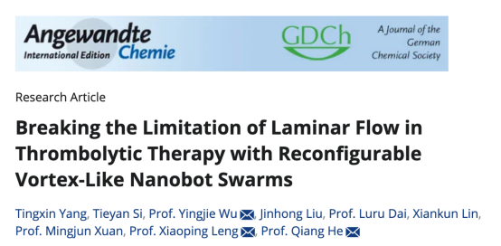 近日,ac米兰官网中文网站附属第二医院冷晓萍教授团队在国际知名期刊Angewandte Chemie International Edition(影响因子16.1)上发表了题为“Breaking the Limitation of Laminar Flow in Thrombolytic Therapy with Reconfigurable Vortex-like Nanobot Swarms”的研究论文,并被评为Hot Paper。该研究利用超声成像技术,探索了微纳米机器人集群在精准清除血栓过程中的动态变化,为血栓性疾病的高效治疗提供了新思路。