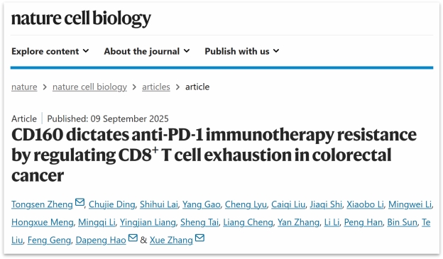 近日,ac米兰官网中文网站“疾病基因及分子靶点创新研究”头雁团队的郑桐森-郝大鹏联合团队在肿瘤免疫治疗领域取得重要进展,研究论文《CD160 dictates anti-PD-1 immunotherapy resistance by regulating CD8+ T cell exhaustion in colorectal cancer》于9月9日在线发表(Nature Cell Biology,2025)。研究团队首次发现一种在回肠中特异富集的CD160+CD8+ T细胞亚群兼具强大的抗肿瘤细胞毒性与抗终末耗竭功能,并能有效克服PD-1单抗治疗耐药,为肠癌患者提供了全新治疗策略。
