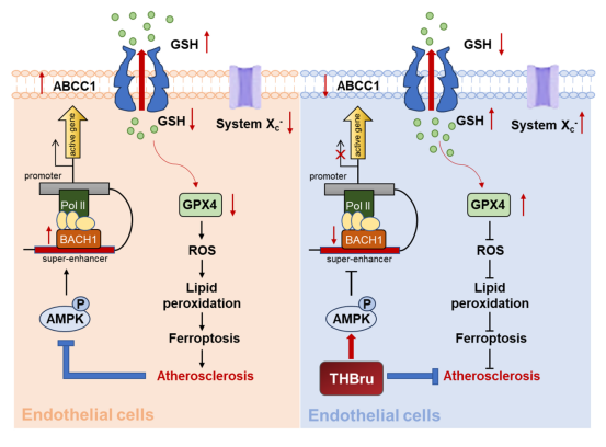 动脉粥样硬化是一种与内皮功能障碍密切相关的慢性血管疾病。铁死亡作为导致内皮功能障碍的重要因素,在动脉粥样硬化进展中起关键作用,针对内皮铁死亡的药物研发为动脉粥样硬化提供了潜在治疗策略。本研究旨在评估四氢小檗红碱对动脉粥样硬化的潜在影响,并阐明其内皮保护作用的分子机制。结果表明,四氢小檗红碱可显著减少动脉粥样硬化小鼠主动脉斑块形成。通过转录组测序及后续验证,发现四氢小檗红碱通过增强谷胱甘肽稳态和减少活性氧(ROS)积累,减轻动脉粥样硬化中的内皮铁死亡。机制上,生物信息学分析显示四氢小檗红碱可降低超级增强子(SE)调控基因ATP结合盒转运体C亚家族成员1(ABCC1)的表达。转录因子BTB与CNC同源蛋白1(BACH1)通过结合ABCC1的超级增强子(ABCC1-SE)驱动其转录,而四氢小檗红碱能有效抑制ABCC1-SE的活性。此外,四氢小檗红碱可促进腺苷酸活化蛋白激酶(AMPK)的激活,从而负向调控BACH1及其下游的ABCC1/铁死亡信号通路。综上,本研究首次发现四氢小檗红碱可作为动脉粥样硬化治疗的潜在候选药物,同时揭示其通过AMPK/BACH1轴调控ABCC1-SE以抑制内皮铁死亡的新机制。