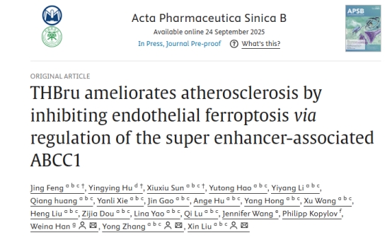 近日,ac米兰寒地心血管病全国重点实验室杨宝峰院士团队张勇教授课题组在动脉粥样硬化研究领域取得新进展,研究成果《THBru ameliorates atherosclerosis by inhibiting endothelial ferroptosis via regulation of the super enhancer-associated ABCC1》被国际知名药学期刊《Acta Pharmaceutica Sinica B》(影响因子:14.6)收录并正式发表。