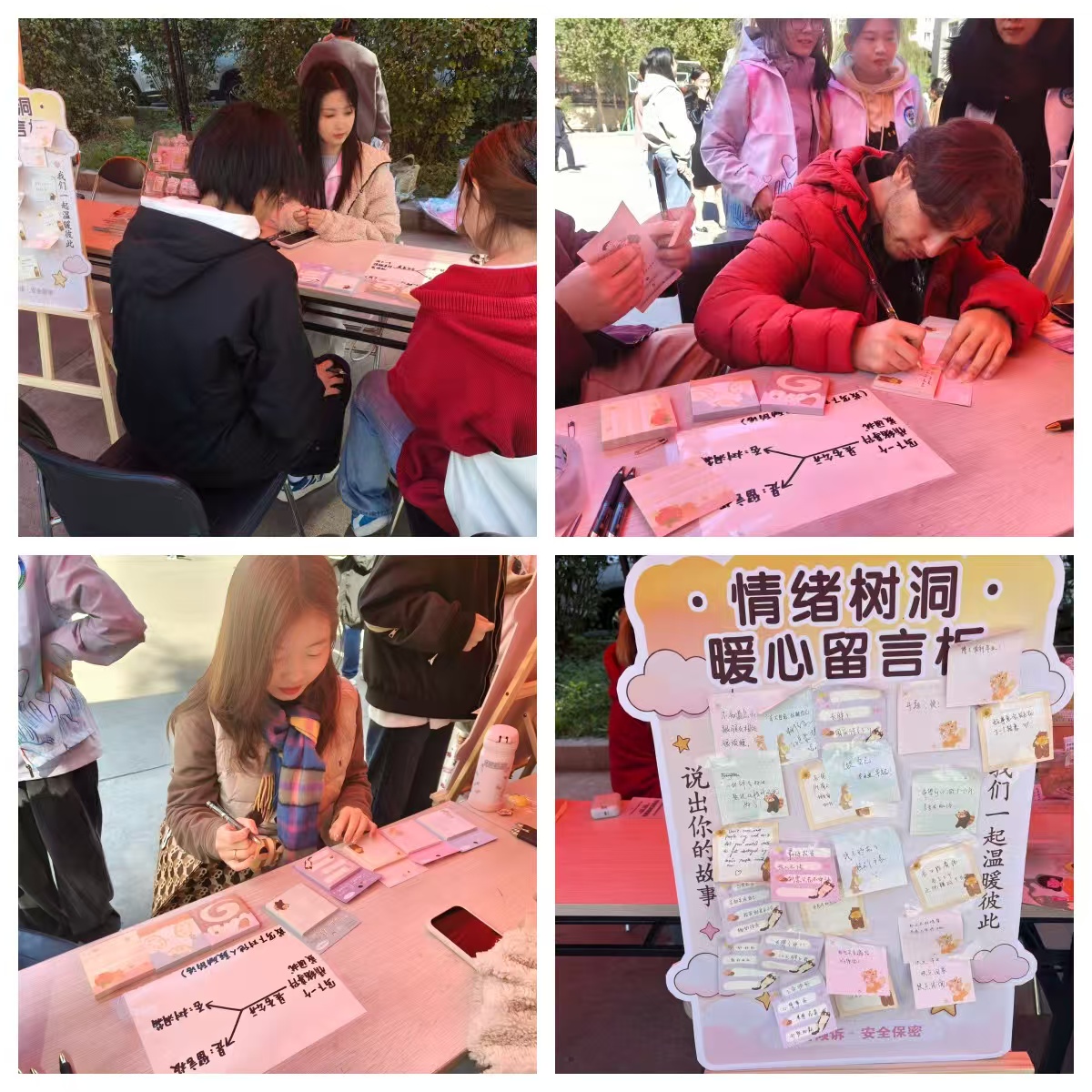 活动现场同学们积极参与心理游戏,洋溢着温暖治愈的氛围。在“情绪树洞”互动区,一张张色彩鲜艳的便利贴整齐摆放,学生们纷纷驻足,将近期的情绪事件或困扰或是对他人的鼓励认真书写在便利贴上,再轻轻贴到“留言板”上或放进“树洞箱”里。许多同学表示,把心事“说”给树洞听后,心中的重担仿佛轻了许多,“看着满墙的便利贴,发现大家都有相似的情绪,突然就不孤单了”。活动之后,研究生心理健康教育与咨询中心的教师们将整理树洞内容,针对共性问题通过公众号发布匿名“树洞回信”,为更多同学提供解决方案。
