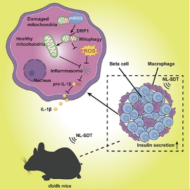 研究团队通过系统的实验研究发现,NL-SDT能够通过瞬时产生线粒体活性氧(mitochondrial ROS)促进骨髓源性巨噬细胞(bone marrow-derived macrophages,BMDMs)中线粒体分裂相关蛋白DRP1的表达,从而促进线粒体自噬。这一过程有效抑制了高糖和棕榈酸(high glucose and palmitic acid,HG/PA)诱导的BMDMs中NLRP3炎性小体的激活及炎症细胞因子IL-1β的分泌。在共培养实验中,研究团队观察到β细胞在与HG/PA处理的BMDMs相互作用时出现显著功能障碍,包括凋亡增加及GSIS降低。而经过NL-SDT治疗的BMDMs与β细胞共孵育后,这种功能障碍得到显著改善。