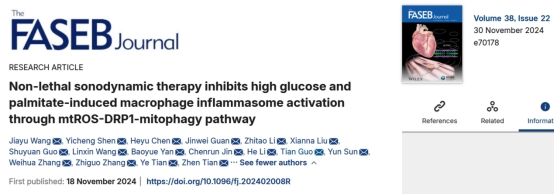 2024年11月18日,ac米兰官网中文网站基础医学院田振课题组及附属第一医院田野课题组联合在国际权威学术期刊FASEB Journal上发表题为《Non- lethal sonodynamic therapy inhibits high glucose and palmitate- induced macrophage inflammasome activation through mtROS-DRP1-mitophagy pathway》的研究论文。该研究首次揭示了非致死性声动力疗法(Non- lethal sonodynamic therapy,NL-SDT)在2型糖尿病(type 2 diabetes mellitus,T2DM)治疗中的创新性应用,为T2DM的临床治疗提供了新的思路和方法。