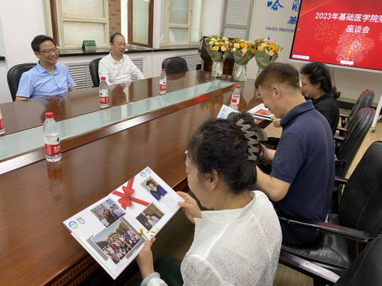 周钦和金焰代表学院领导班子为荣休教师颁发纪念相册,并献上鲜花,表达学院美好的祝愿。